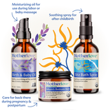 This bundle contains three time-tested herbal products for an empowered birth and postpartum journey. Help prepare for labor with Birth & Baby Oil and care for your postpartum body with Mom's Bottom Balm Balm (formally called Rhoid Balm), and Sitz Bath Spray.